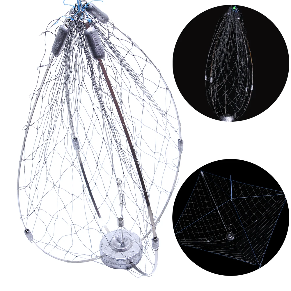 1 pc universal cage style fishing net, suitable for crab catching in saltwater environments. This net is designed to be retractable and is made from durable steel wire, weighing between 400g to 550g.