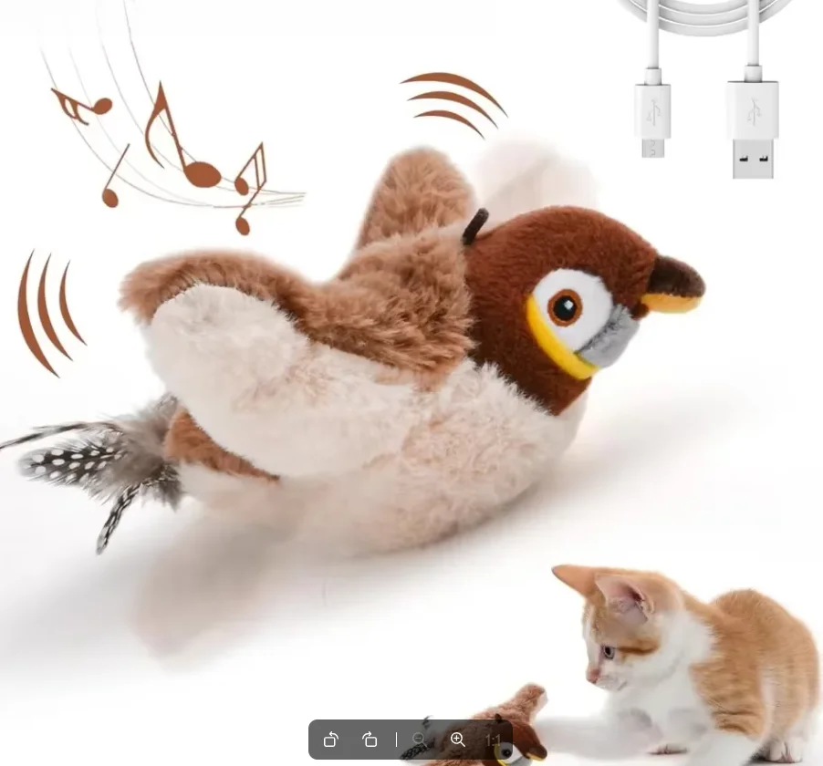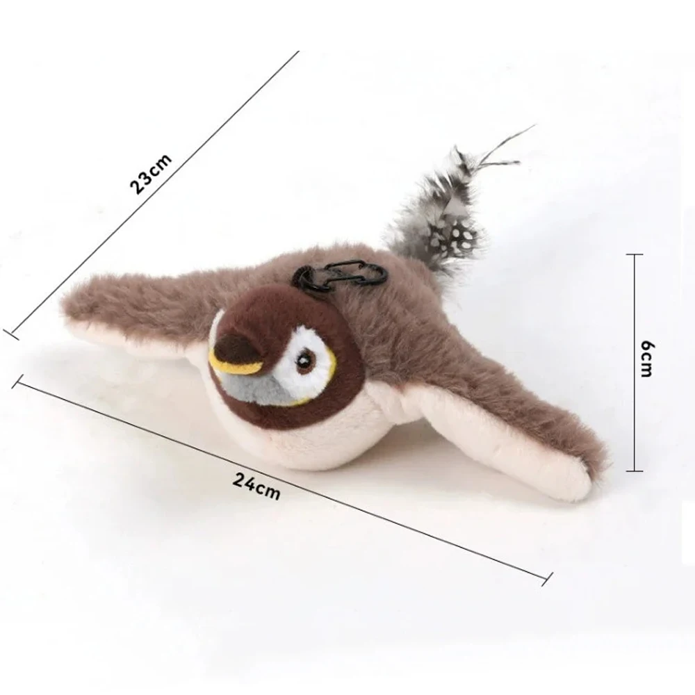 This interactive plush toy is designed for cats, featuring realistic bird sounds and flapping wings to engage your pet in play. It is USB rechargeable and activates with motion, providing endless entertainment for your furry friend.
