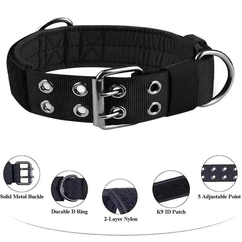 This Medium to Large Nylon Tactical Pet Dog Collar is designed for durability and adjustability, making it suitable for medium and large dogs.