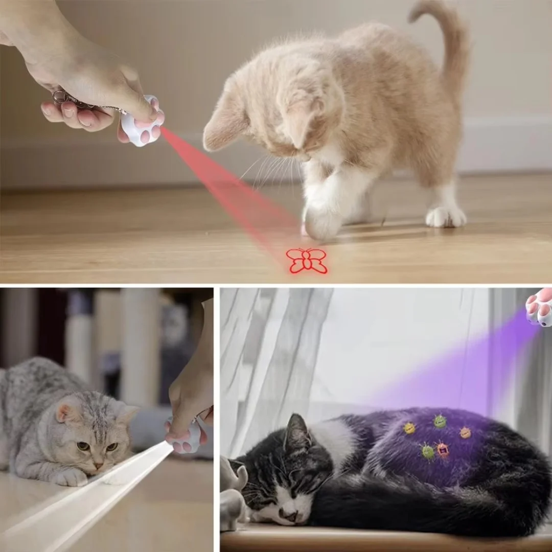This multifunctional 4-in-1 pet toy is designed for cats, featuring an infrared teaser and keychain lighting. It is rechargeable and offers various patterns to keep your pet engaged and entertained.