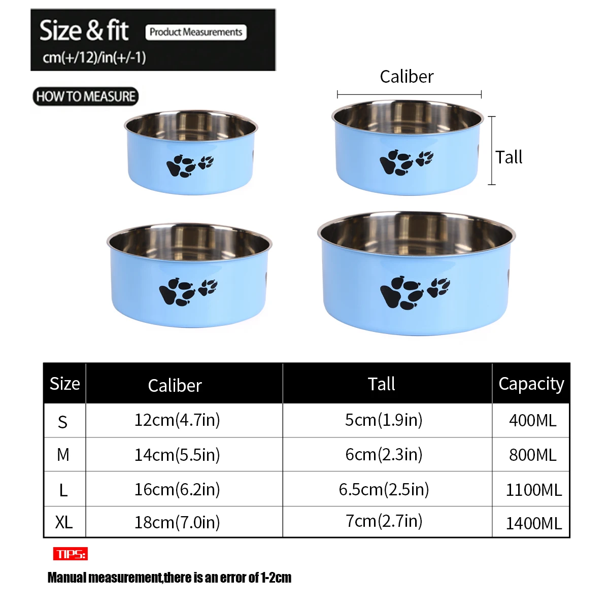 This pet dog bowl features a playful cartoon footprint design and is made of thickened stainless steel, making it suitable for both indoor and outdoor use.