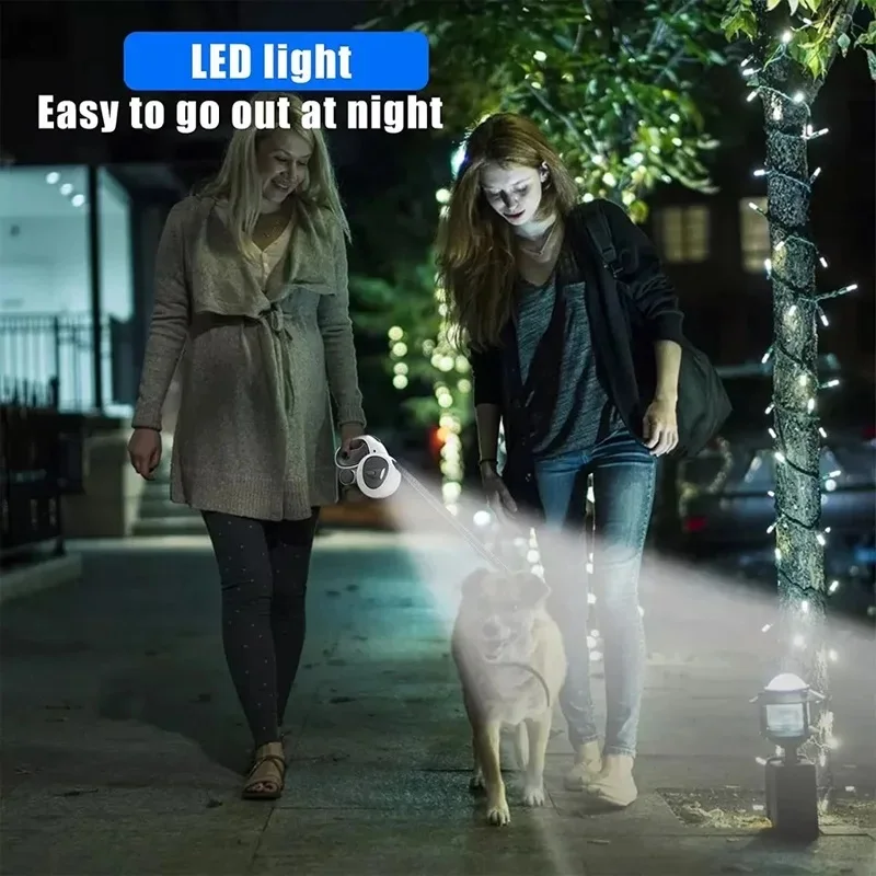 This automatic retractable pet leash is designed for convenience and safety during walks with your dog. It features a 5-meter long lead that allows your pet to explore while remaining securely attached. The leash includes a waste bag dispenser for easy clean-up and a durable LED light for visibility in low-light conditions.