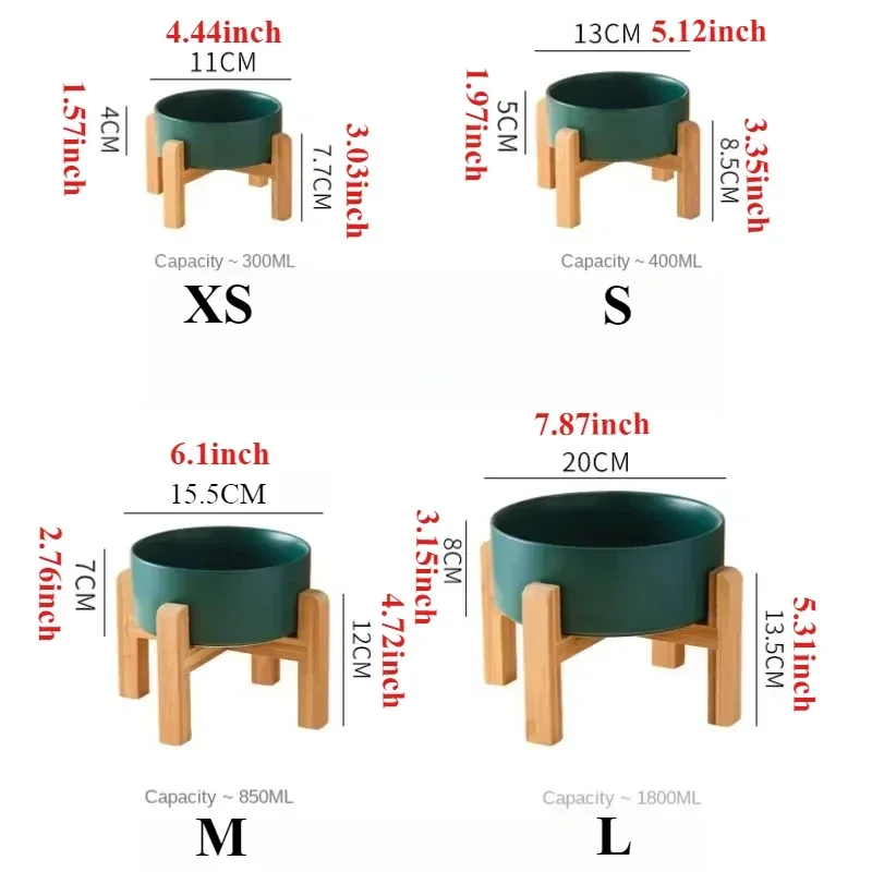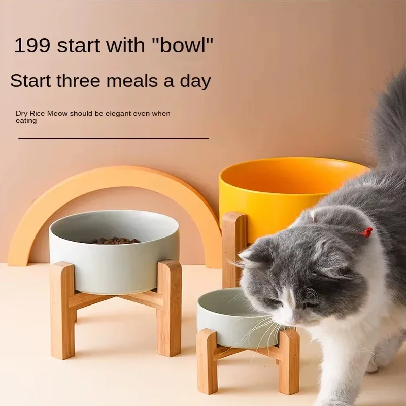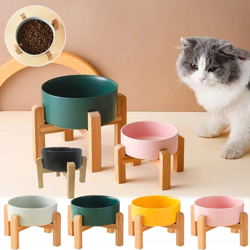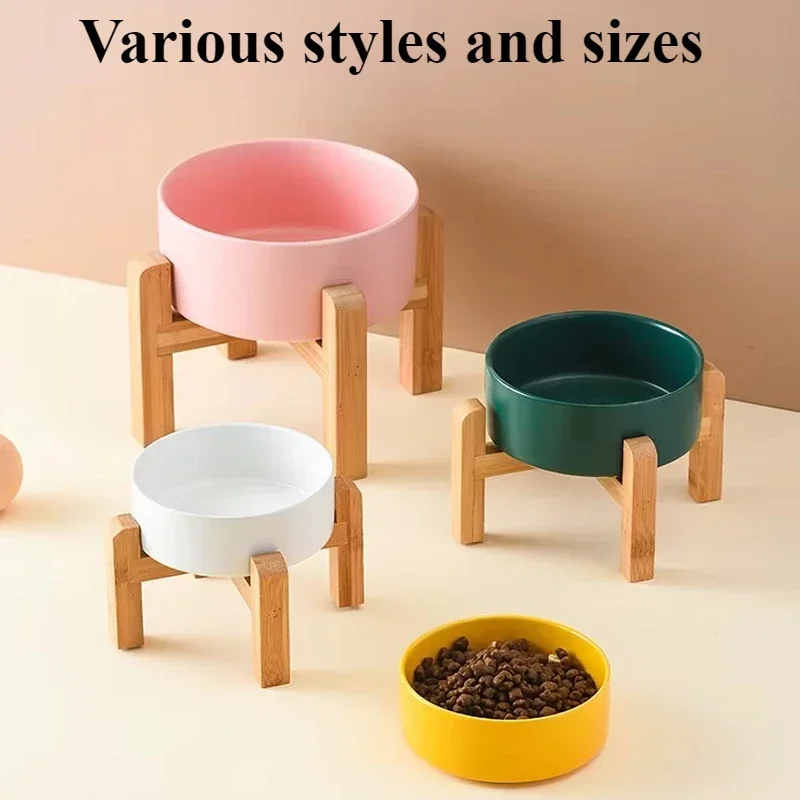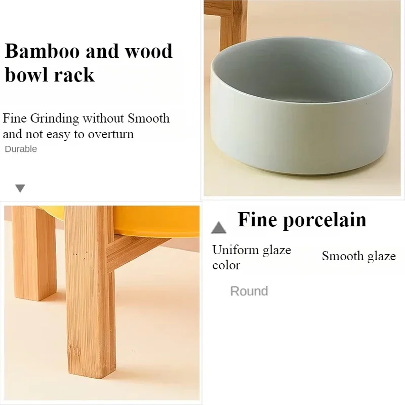 Ceramic Dog Bowl with Wooden Stand Splash Proof Pet Feeding Supplies