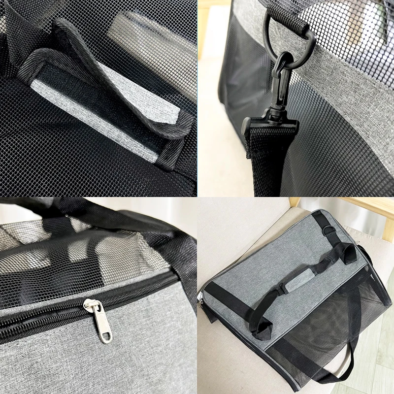 This portable dog carrier bag is designed for travel with your pets, providing a comfortable and breathable environment. The mesh ventilation grid ensures your pet stays cool, while the durable materials offer resistance to wear and bites. The spacious interior allows your pet to relax and reduces travel anxiety.