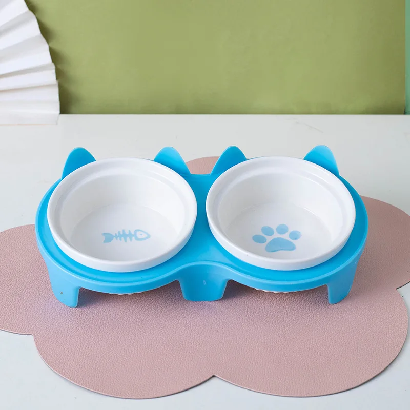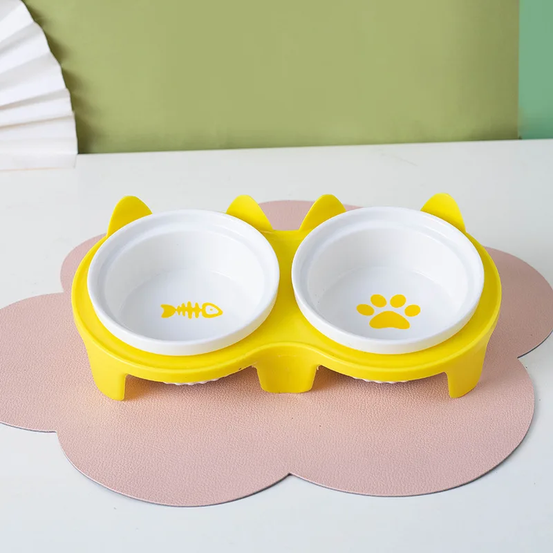 Cat Bowl Ceramic Double Bowl for Food and Water Pet Oblique Mouth Design