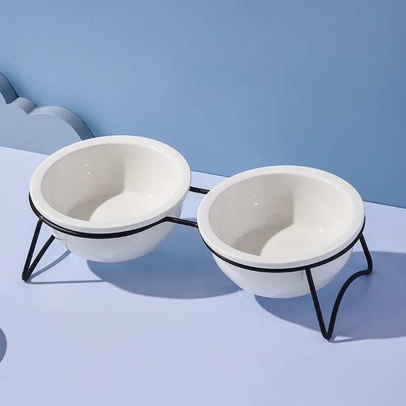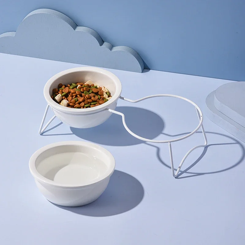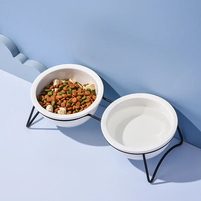 Cat Ceramic Double Food Water Bowls White Small Dog Drinking Eating Feeding Bowl with Stand Pet Neck Guard Feeders