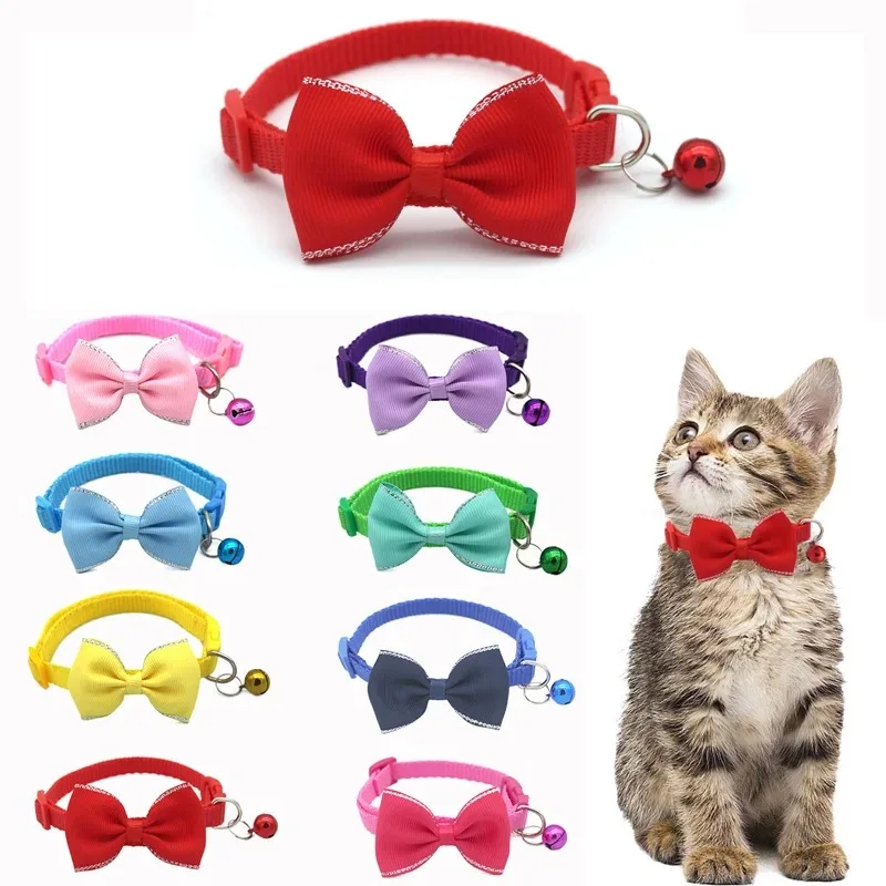 This solid color bowknot cat collar is designed for small pets like puppies and Chihuahuas. It features a charming bow tie and a bell, making it a stylish accessory for your beloved pet. The collar is adjustable for a comfortable fit and is easy to wear.