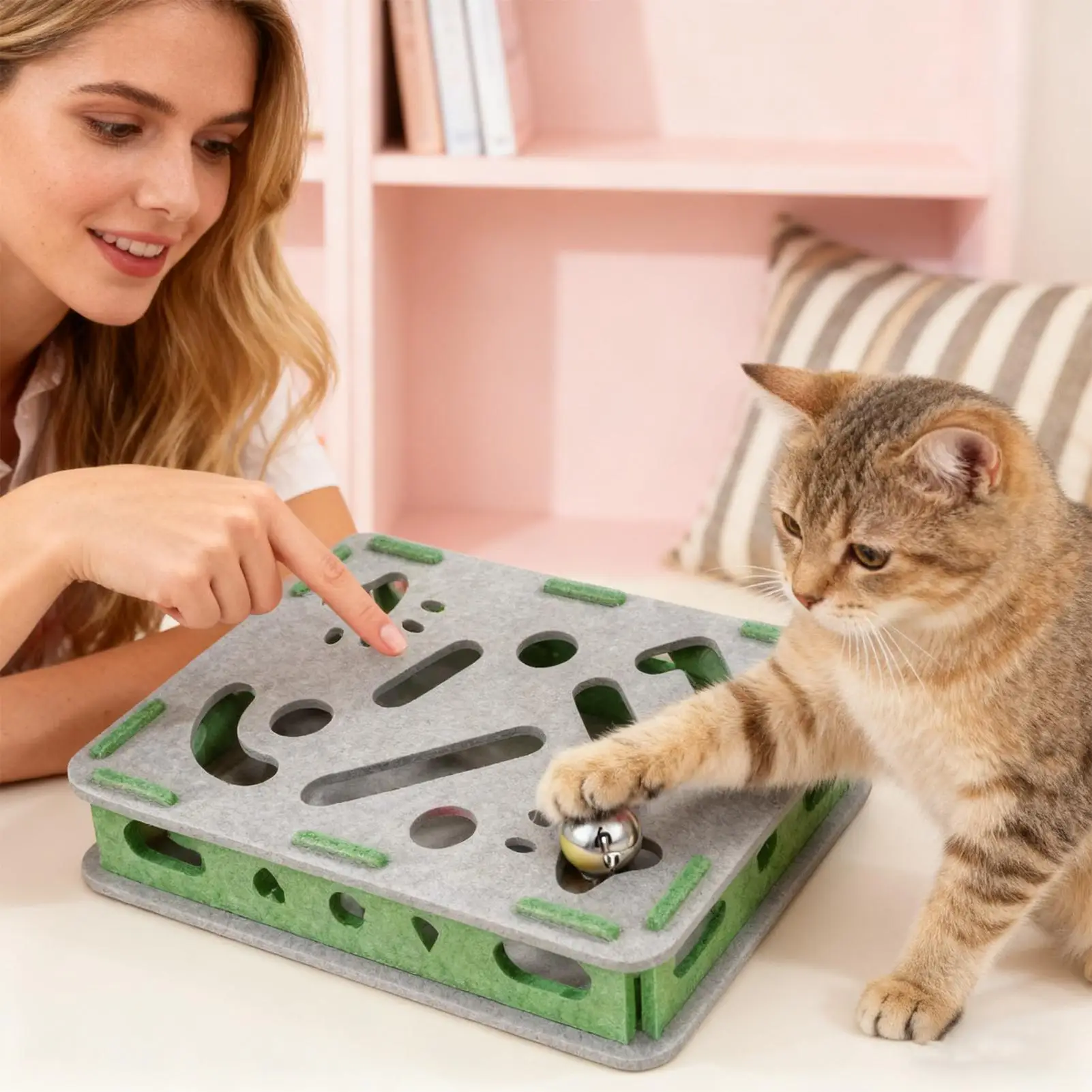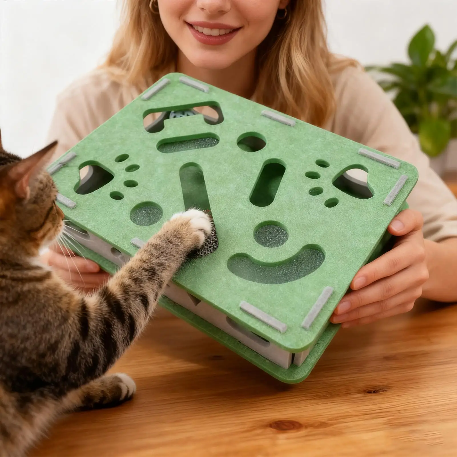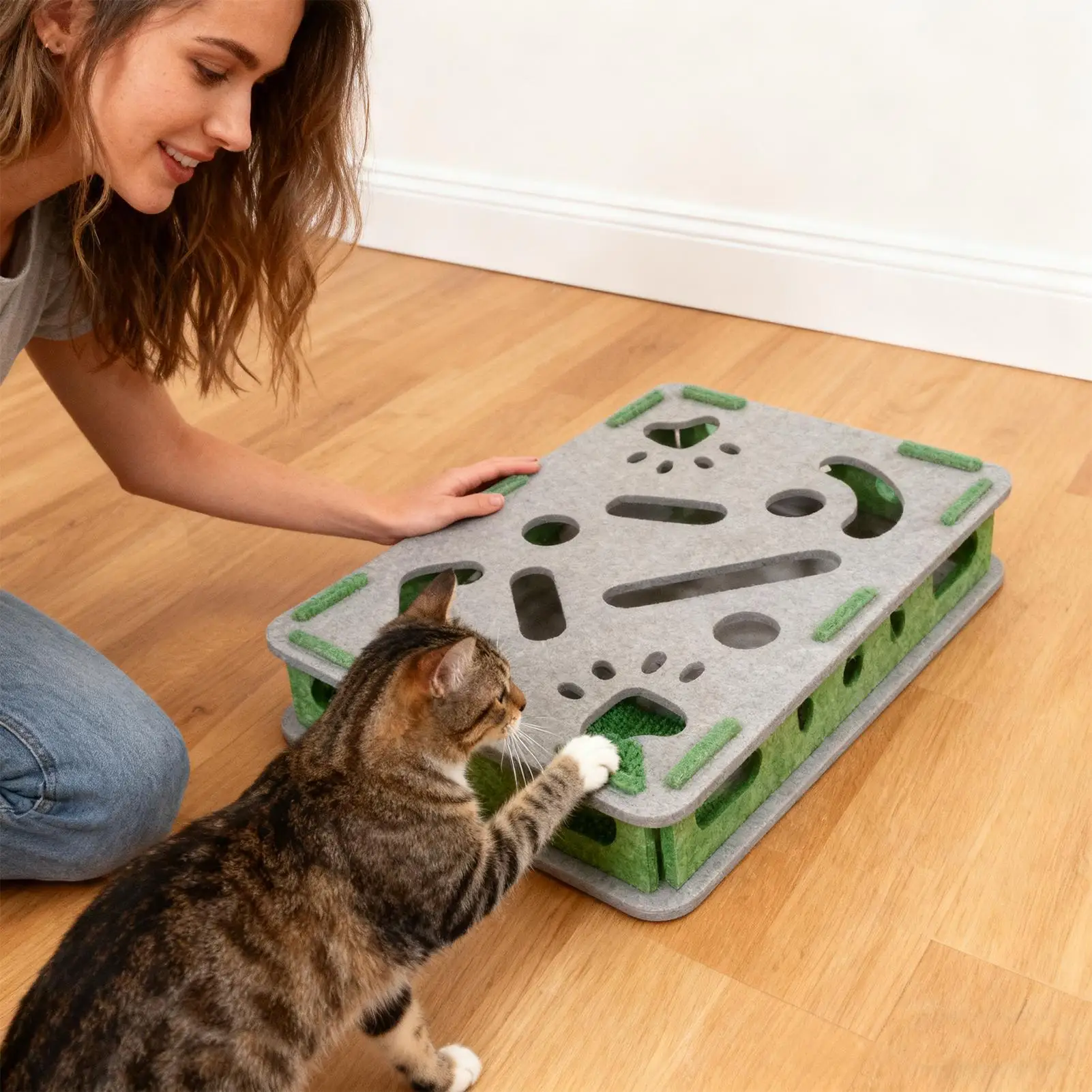 This interactive cat scratch toy and nail file box is designed to provide enrichment for your indoor kittens and cats. It features a unique design that not only protects your furniture but also encourages healthy scratching behavior. The combination of a felt pad and engaging elements makes it an essential addition to your pet’s playtime.