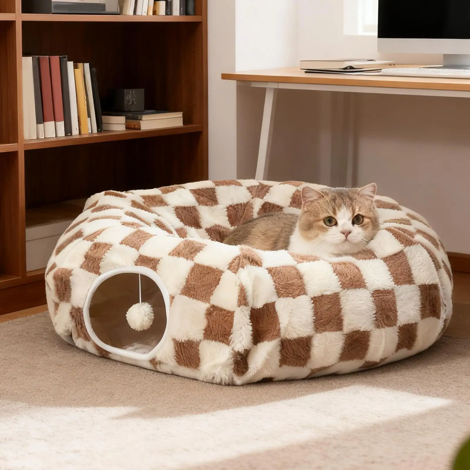 This Cat Tunnel Bed is a versatile and engaging play space for your pets, designed to provide comfort and entertainment. It features a unique donut shape that encourages your pets to explore and play, making it an ideal addition to your home for kittens, puppies, and small dogs.