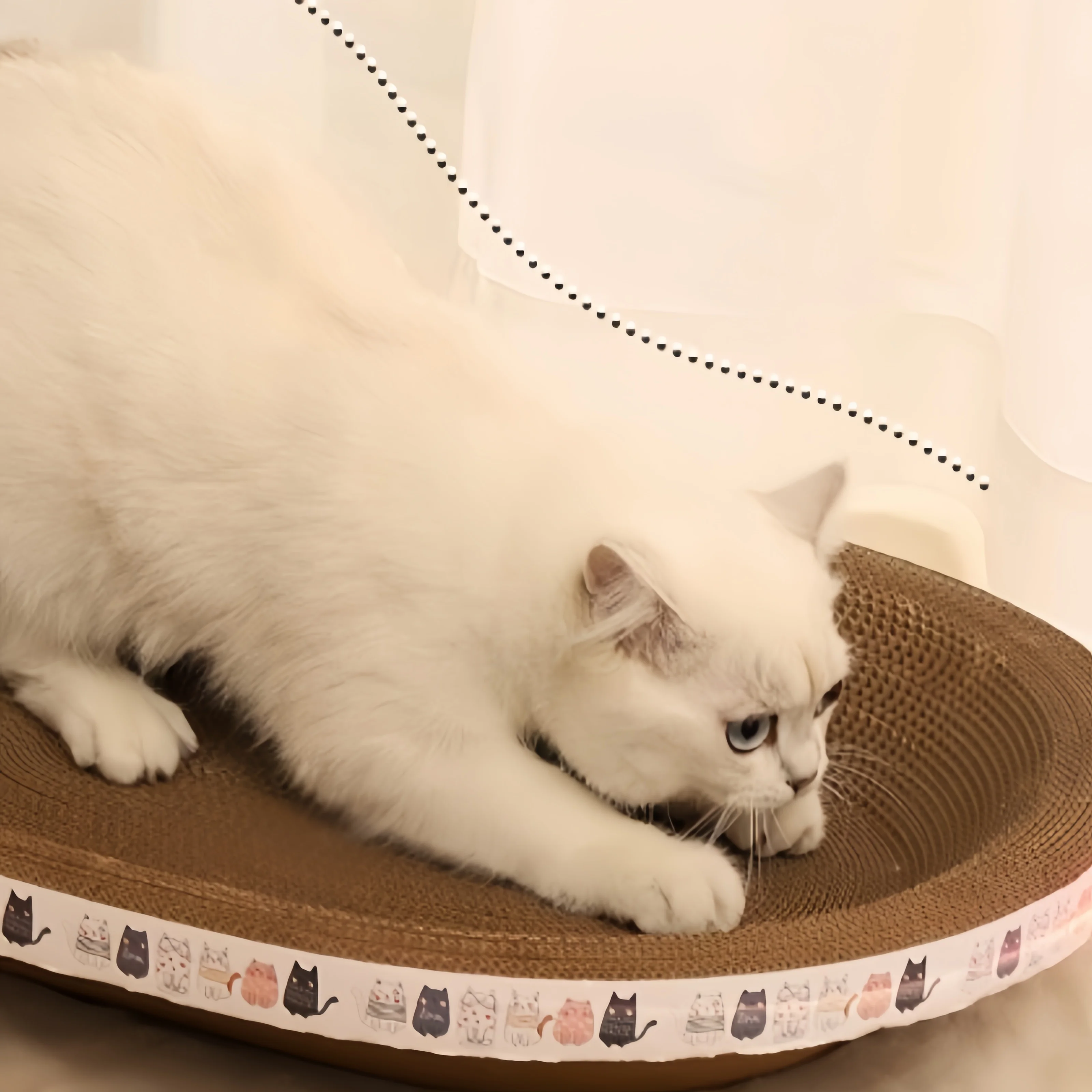 This corrugated cat scratching board features an oval design that is perfect for your feline friend. It serves as both a scratching surface and a cozy resting spot, helping to protect your furniture while providing a satisfying outlet for your cat’s natural scratching instincts.