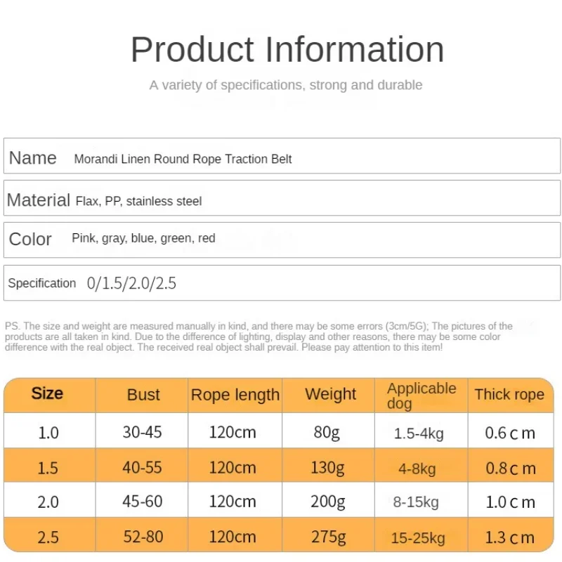- Size 1.0: Chest 30-45cm, Rope Length 120cm, for dogs weighing 1.5-4kg