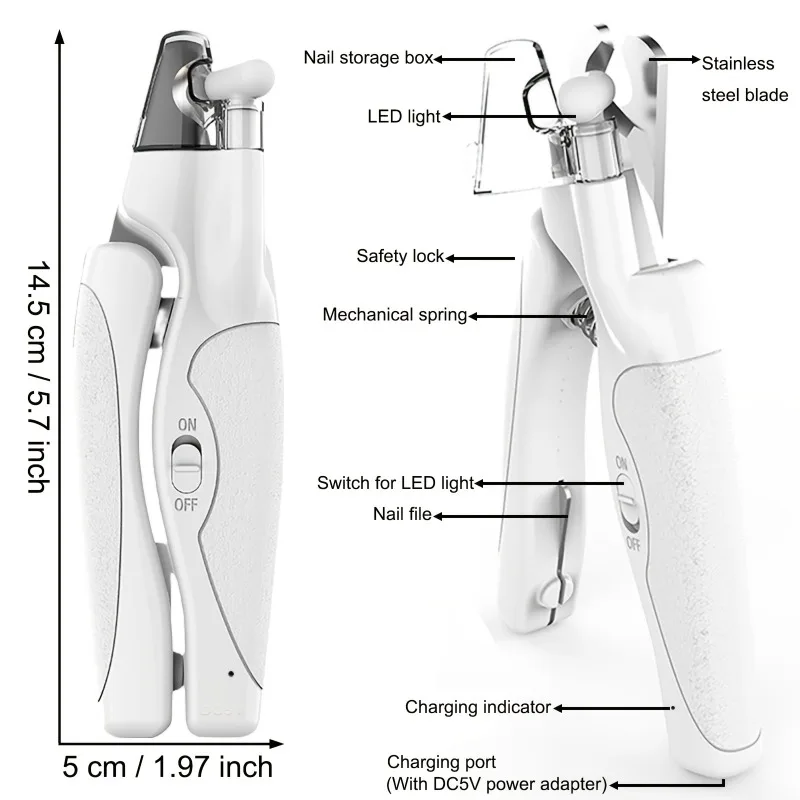 This professional dog and cat nail clipper features an LED light for safe and precise trimming. It is designed for easy use and comes with USB charging capabilities, making it an essential grooming tool for pet owners.