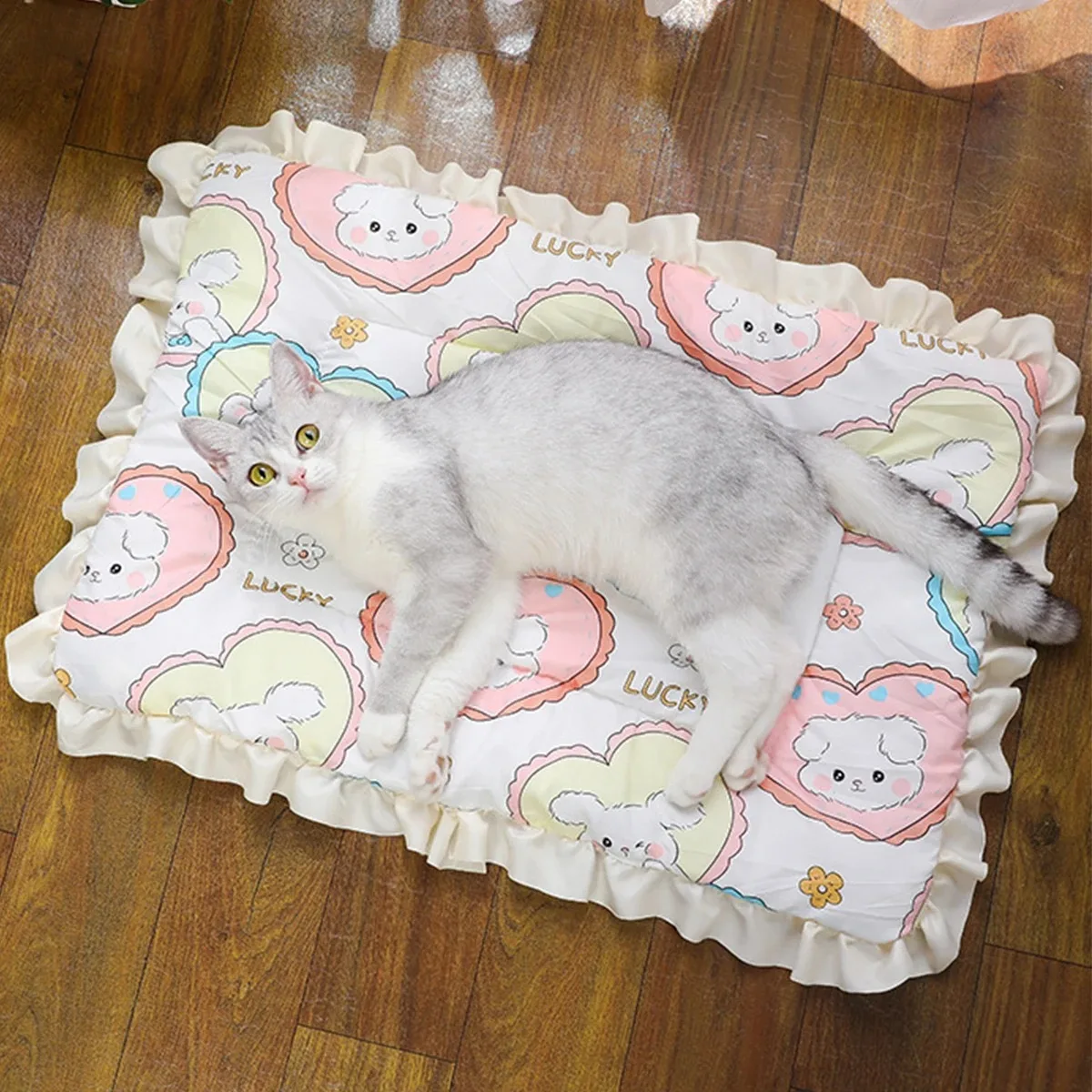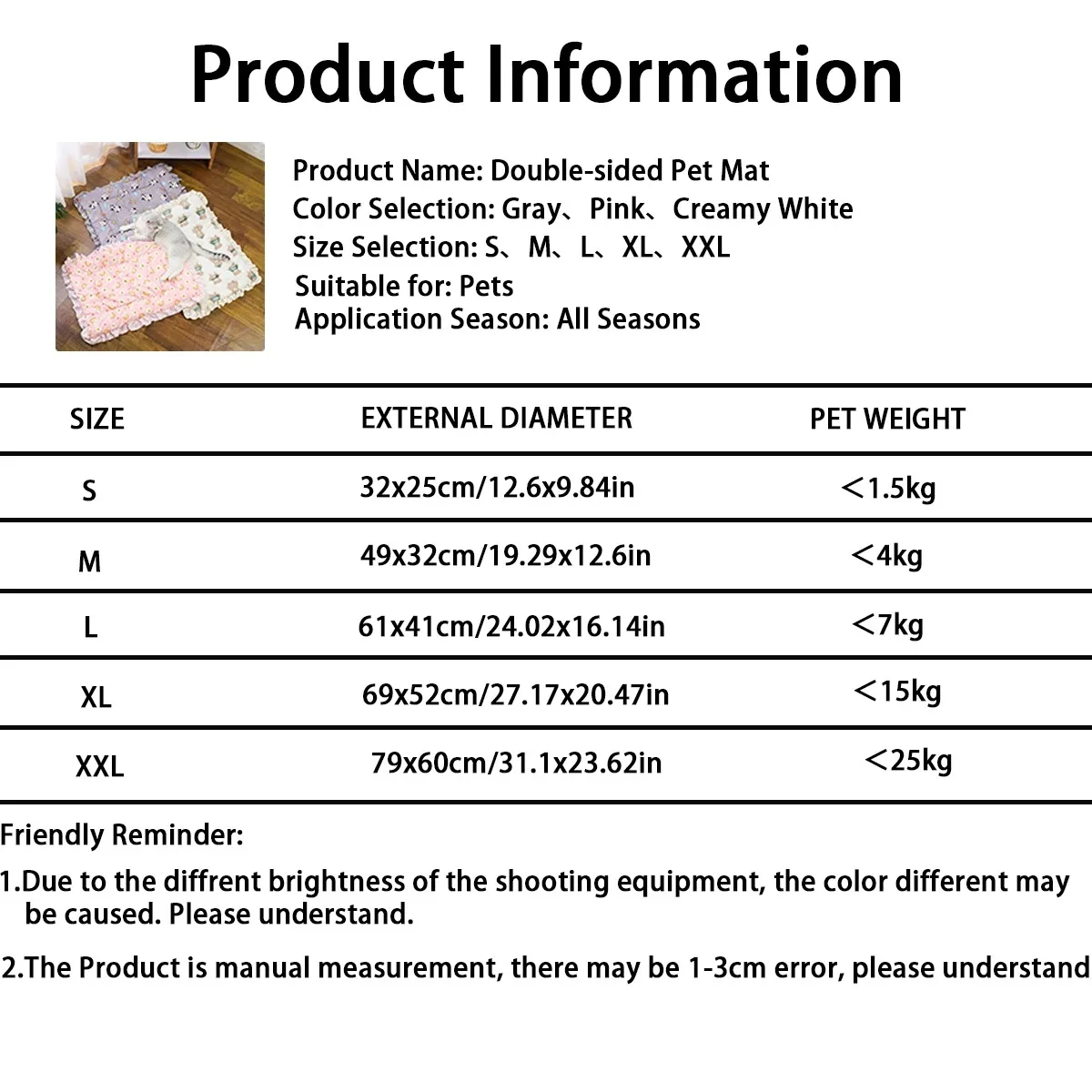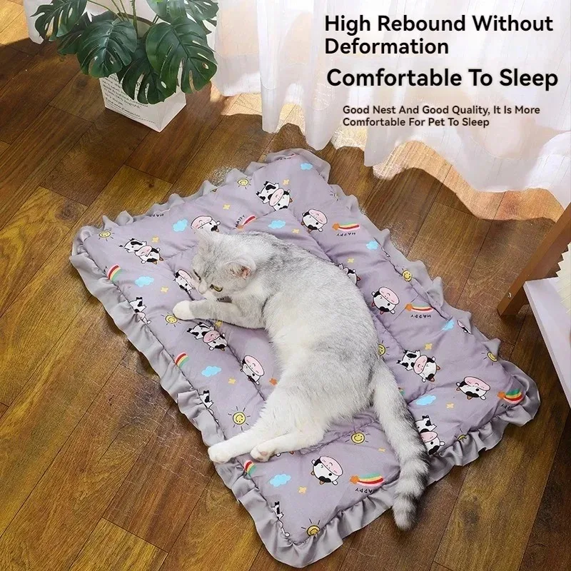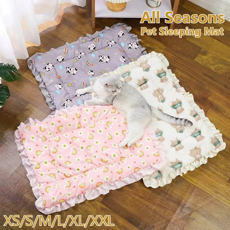 This double-sided pet sleeping mat is designed to provide comfort for your pets throughout the year. It features a smooth cotton fabric on one side and a plush fabric on the other, making it suitable for both warm and cold seasons.