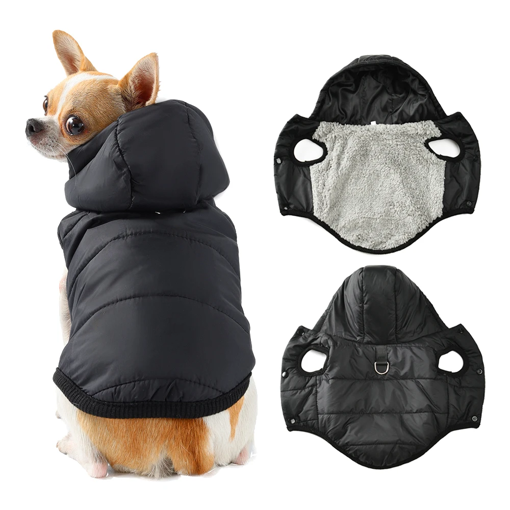 This winter dog hoodie coat is designed for small to medium dogs and cats, providing warmth and comfort during the colder months. It features a soft, thick fleece material that is windproof and includes a hood for extra protection. Ideal for outdoor activities like walking and hiking, this coat is perfect for breeds such as French Bulldogs, Chihuahuas, and Pugs.