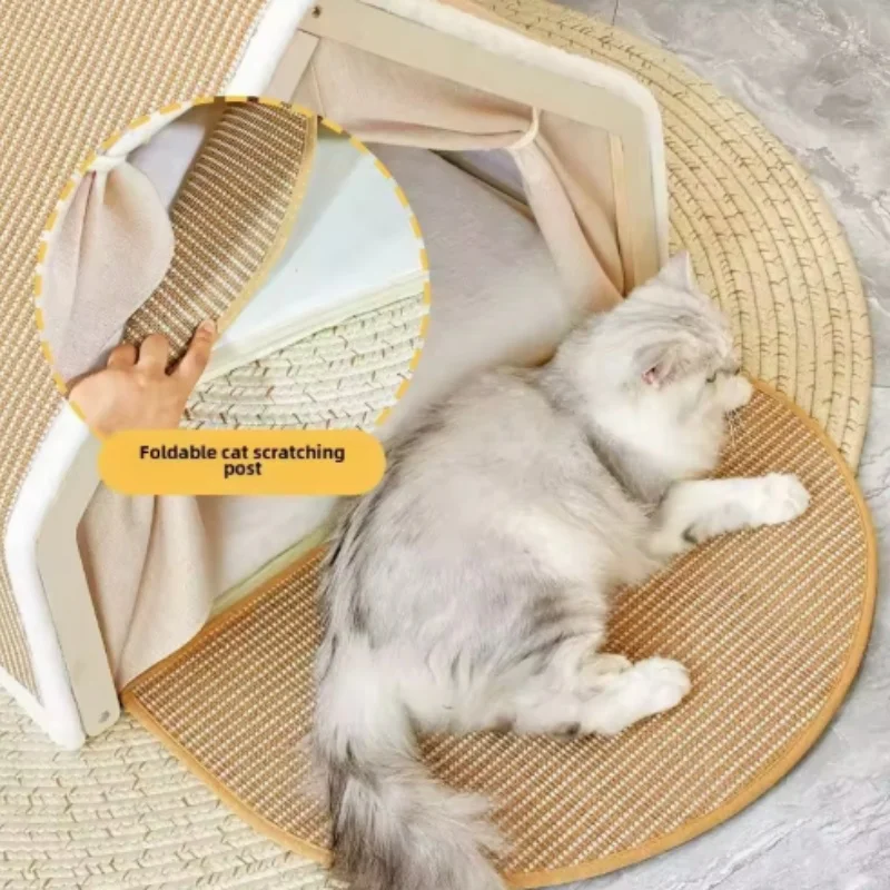 Half-Enclosed Wooden Cat Tent Villa Pet Bed All-Season Dual-Use Sisal Scratching Board
