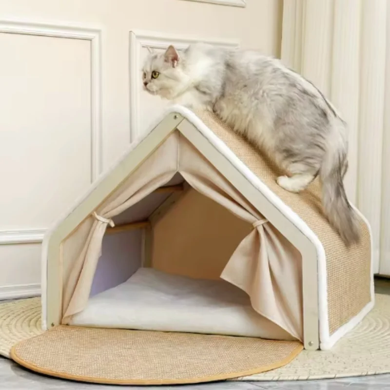 This Half-Enclosed Wooden Cat Tent Villa is designed to provide a cozy and comfortable space for your cat. It features a dual-use design that serves as both a pet bed and a sisal scratching board, making it perfect for play and rest.