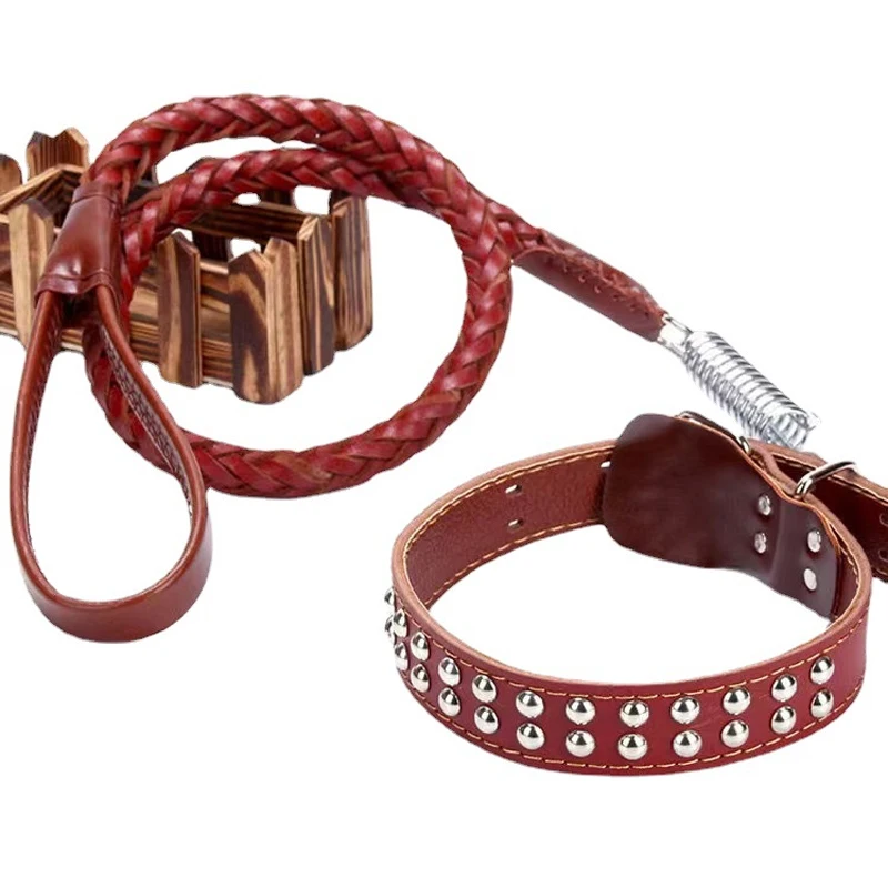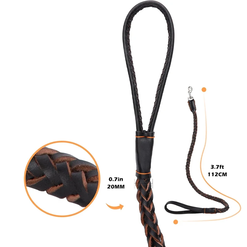This heavy-duty large dog leash is made from genuine leather and features a braided design, making it ideal for training medium to large dogs such as Shepherds, Alaskan Malamutes, German Shepherds, Samoyeds, and Golden Retrievers. Its robust construction ensures reliability and durability, providing a stylish appearance while maintaining strong traction.