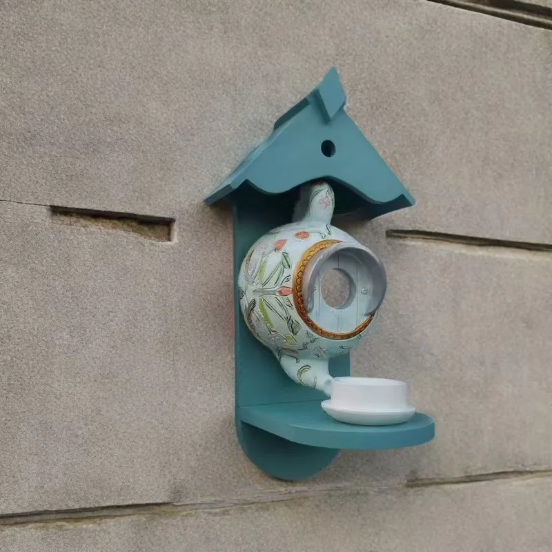 This green teapot bird house and feeder is a charming addition to your courtyard, perfect for attracting birds while enhancing your garden’s decor. Its unique design mimics a teapot, making it a delightful accessory for any outdoor space.