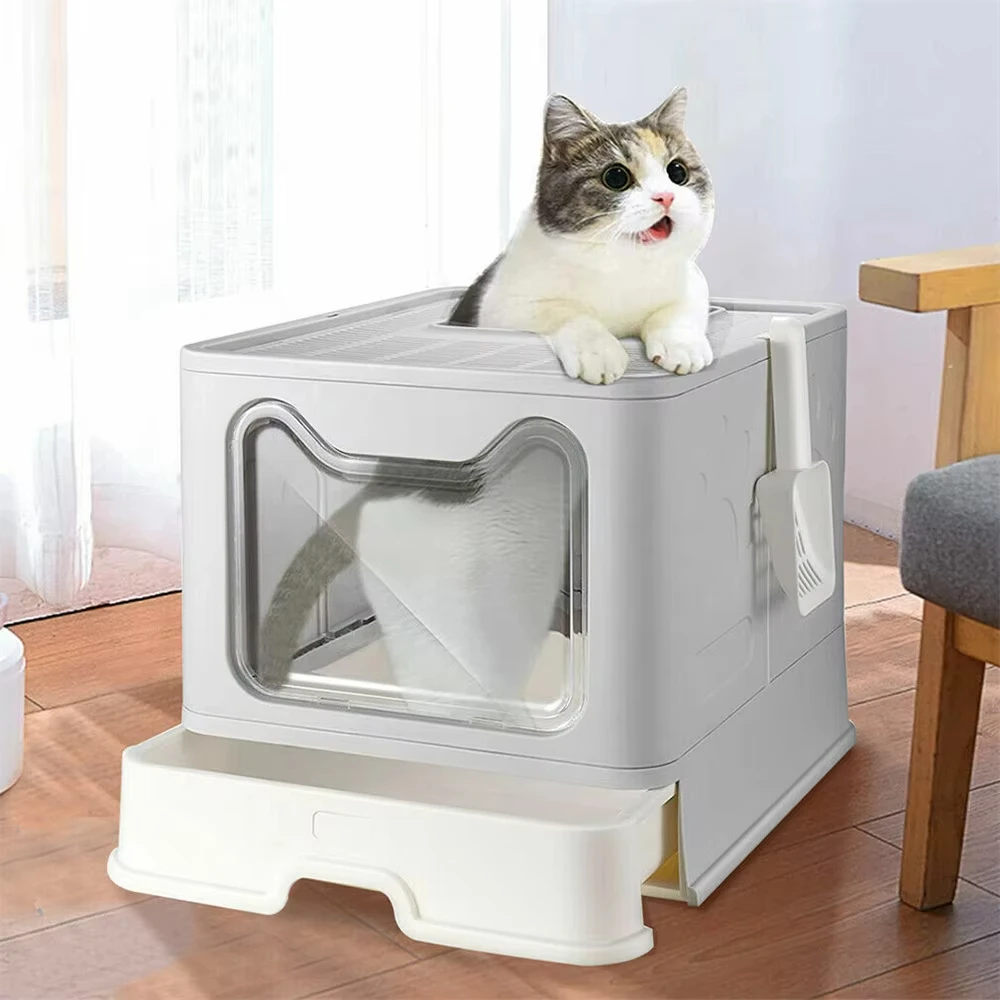 This large cat litter box features a convenient drawer for easy cleaning and an anti-splash design, making it ideal for multiple cats. Its high sides help contain litter, ensuring a tidy environment for your pets.