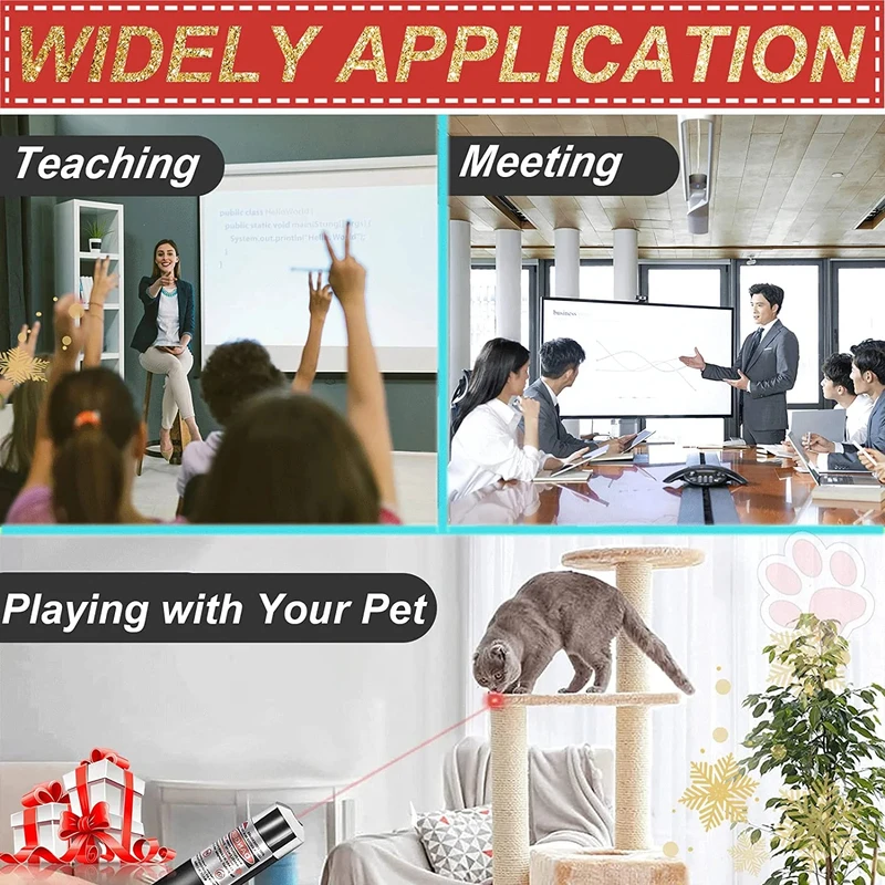 This laser pointer is designed for various applications including teaching, demonstrations, and entertainment for pets. It features three different laser colors: red, purple, and green, allowing for versatile use in different environments.
