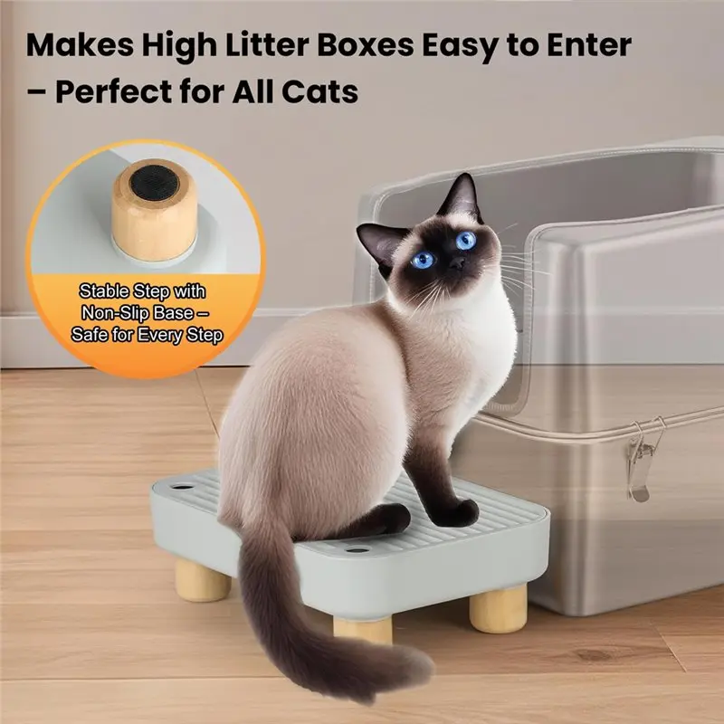 This litter box step is designed to provide a safe and comfortable way for small and elderly cats to access their litter box. With a spacious surface and a sturdy wooden base, it ensures stability and ease of use for your feline friends.