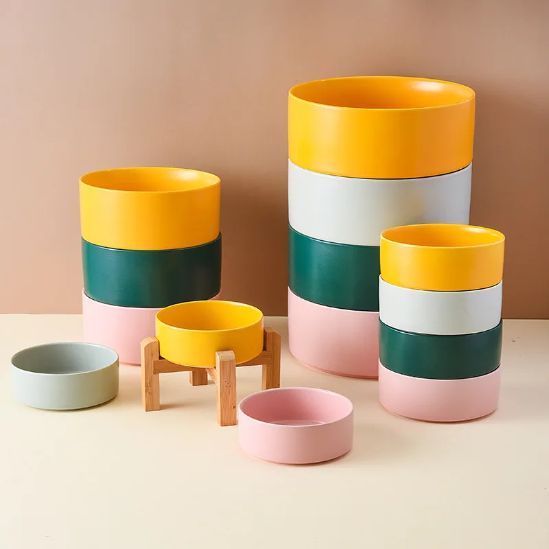 Ceramic Elevated Dog Bowl with Wooden Stand Multi-sized Pet Food Water Feeders