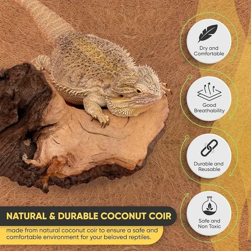 The Natural Coco Fiber Pet Coir Mat is an ideal bedding solution for various reptiles including lizards, turtles, snakes, iguanas, geckos, and bearded dragons. This mat provides a comfortable and safe environment for your pets, mimicking their natural habitat.