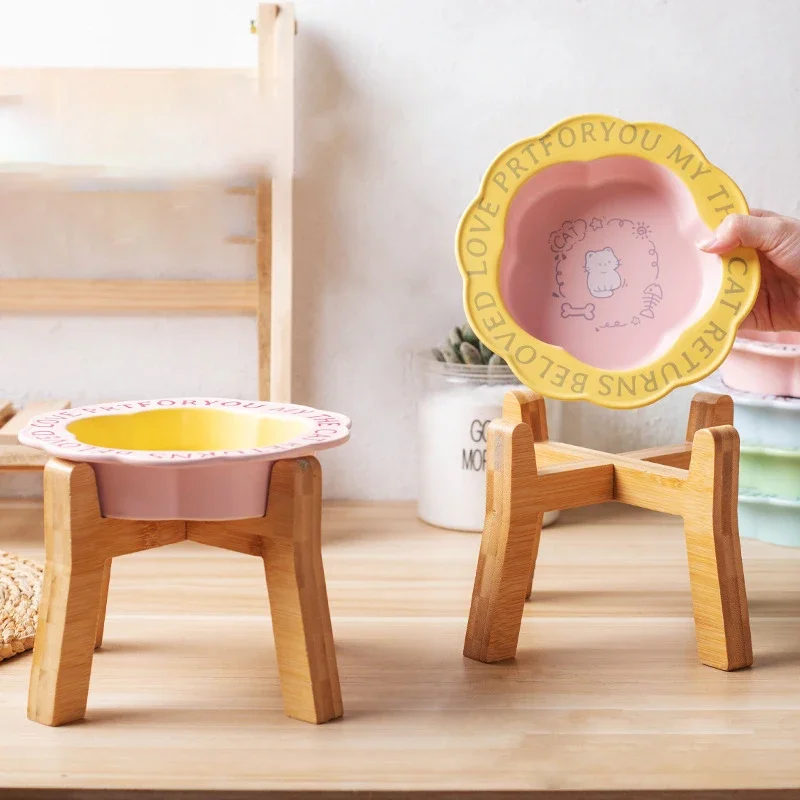 Persian Cat Ceramic Food Bowl with Wooden Shelf Anti-Knockover Small Dog Bowl