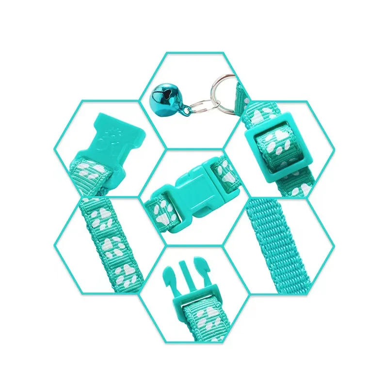 This colorful pet collar is designed for both cats and small dogs, featuring a charming bell and a playful cartoon footprint pattern. It is adjustable for a comfortable fit and comes in a variety of vibrant colors.
