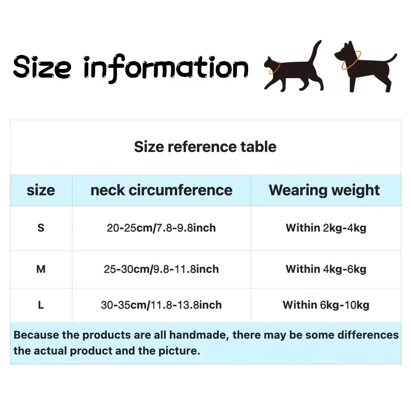 These collars are adorable and 100% handknit with soft yarn, but i think i got all three sizes by accident - i ordered three collars in a size small, but you can see from the photos that it looks like i got a small pink, medium orange, and large purple collar. The pink collar measures 60 cm flat from end to end, the orange one 73 cm, and the purple one 54 cm. It’s weird that the purple one has the shortest total length considering that it has the largest flowers and it’s the largest overall. I would recommend, but be aware that you’re not going to receive a totally uniform product, and it might be a bit larger or smaller than you expect.