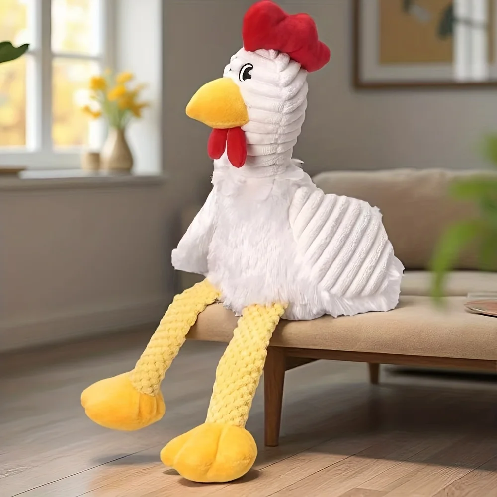 This plush raw chicken toy is designed for large dogs, providing them with a fun and durable playtime experience. The rooster design features a squeaker that engages your pet, making it an ideal chew toy for dogs who love to gnaw and play. Its indestructible quality ensures that it can withstand tough chewing, making it a reliable companion for your furry friend.