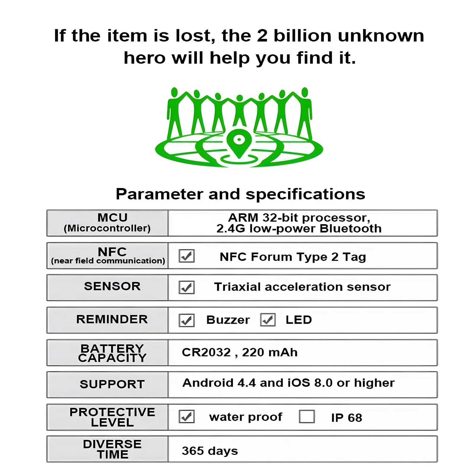 - Battery capacity of 220mAh (CR2032) with a lifespan of up to 365 days.