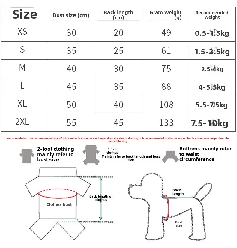 - 2XL – Chest Girth: approximately 55cm, Back Length: approximately 45cm, suitable for pets weighing about 7.5-10kg.
