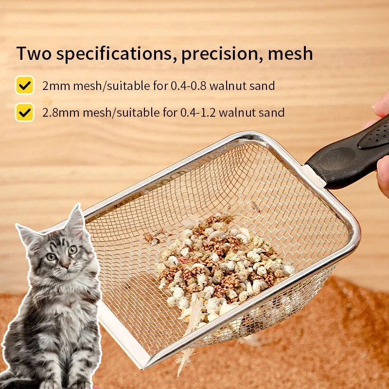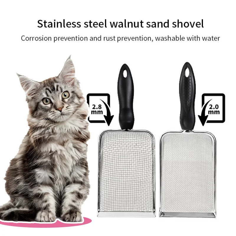 This stainless steel cat litter shovel is designed for easy cleanup of cat litter and other substrates. Its fine mesh sifter allows for efficient separation of waste from clean litter, making it a practical tool for pet owners.