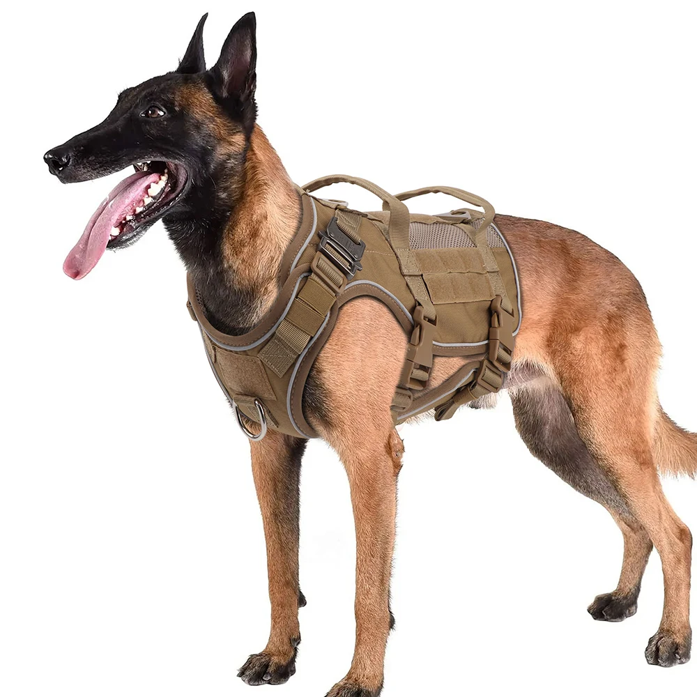 The Tactical Military Dog Harness is designed for medium to large dogs, such as German Shepherds. This durable nylon vest harness features a handle for easy control and is perfect for pet training and outdoor activities.