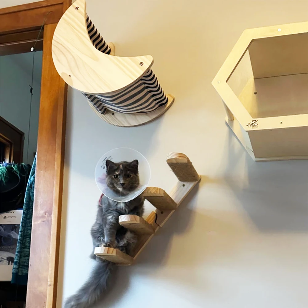 This cat climbing frame features a unique moon shape design, providing a cozy and stylish space for your feline friend to relax and play. It is perfect for wall mounting, saving floor space while offering a fun climbing experience for your cat.