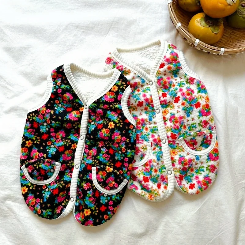 This warm pet vest coat features a floral print design and is made from soft fleece material, perfect for keeping your small to medium-sized dog comfortable during the winter months. The two-legged design makes it easy to put on and take off, ensuring your pet stays cozy and stylish.